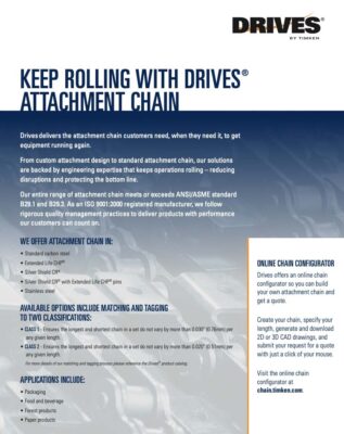 Use our Chain Configurator or Chain Engineer Mobile Web App for assistance selecting the right chain for your application. If you have a challenging demand beyond the scope of a standard Drives® chain, we would be excited to partner with you to provide custom-manufactured solutions to meet your specific needs.